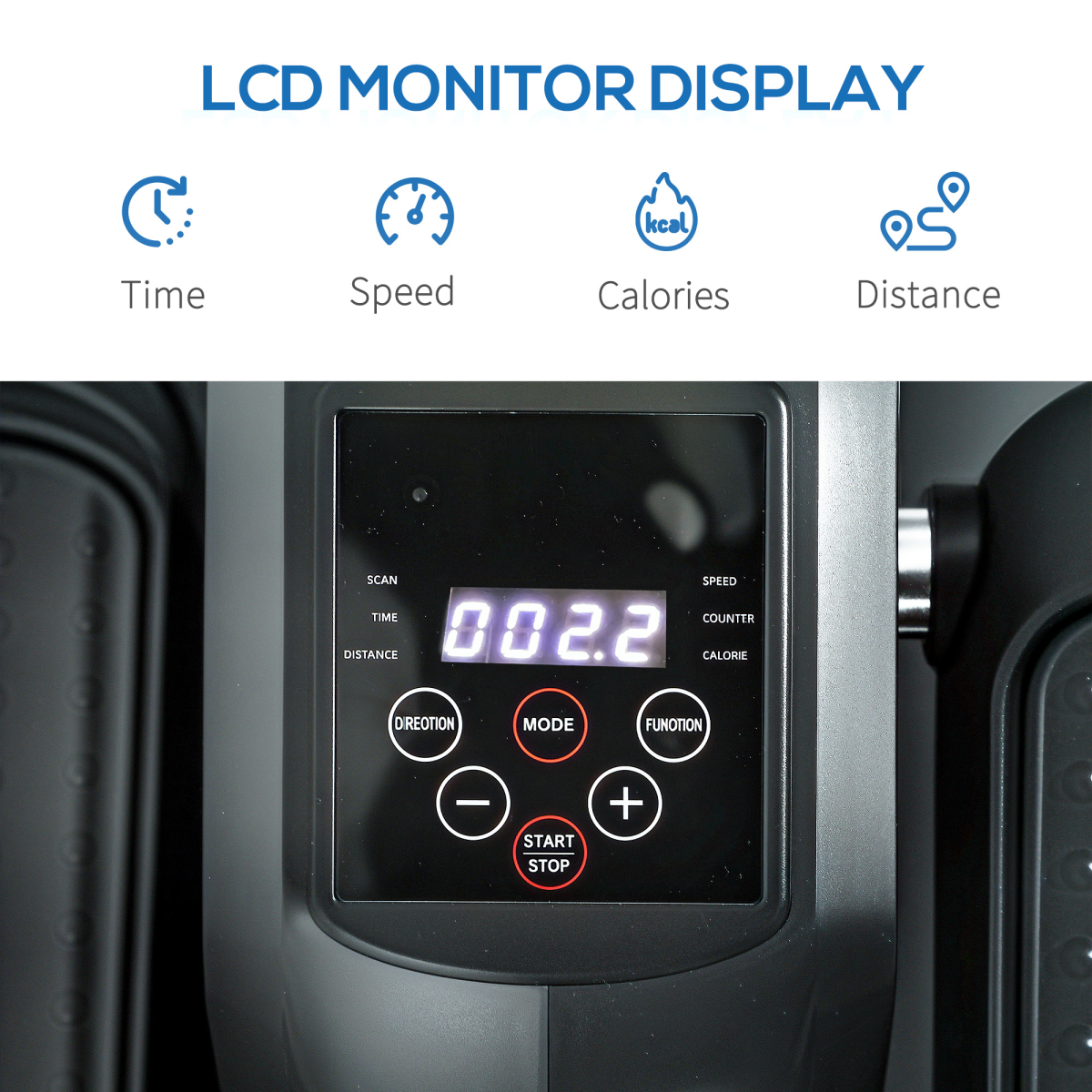 ● LCD monitor tracks time, speed, distance and calories
